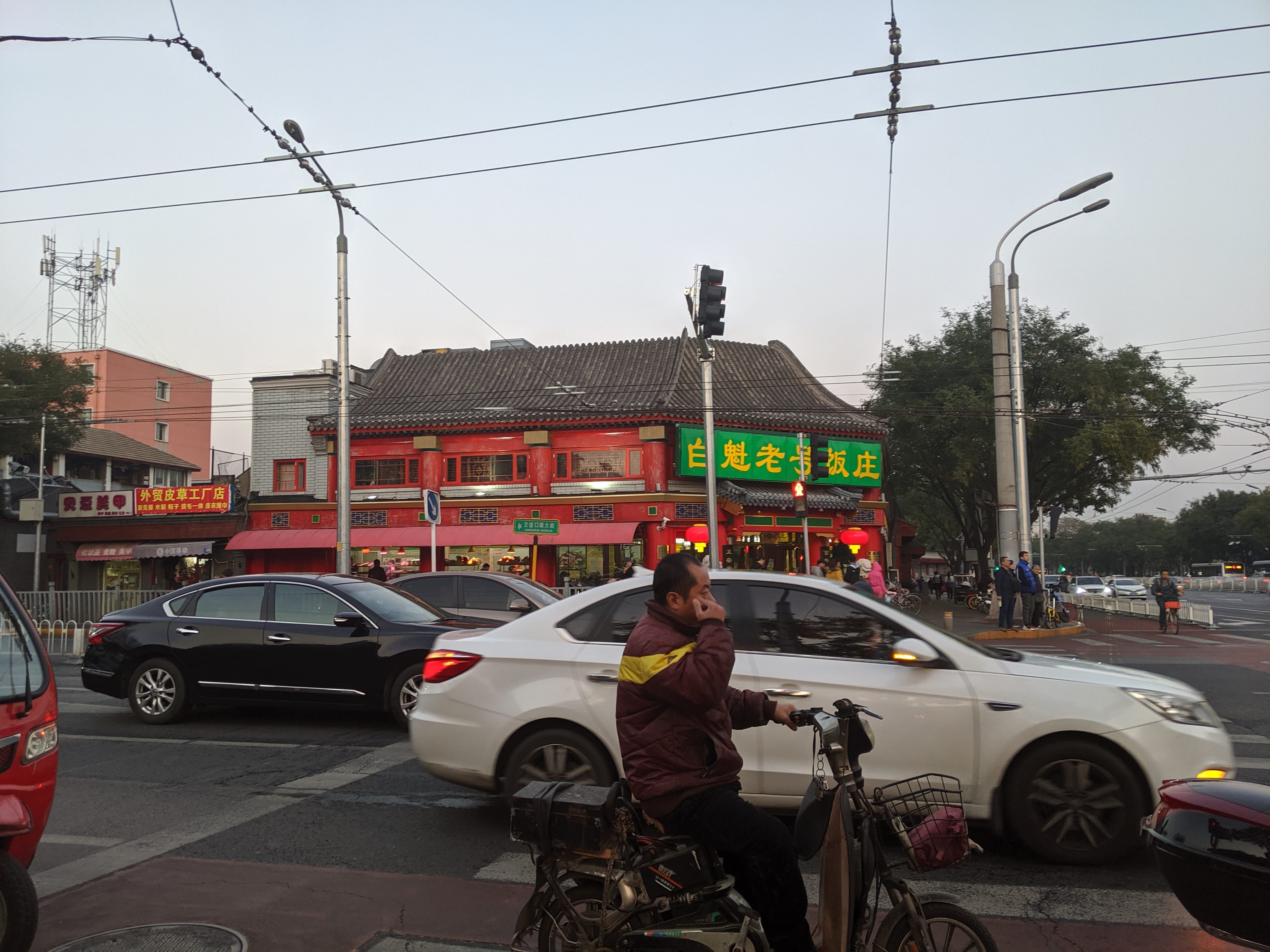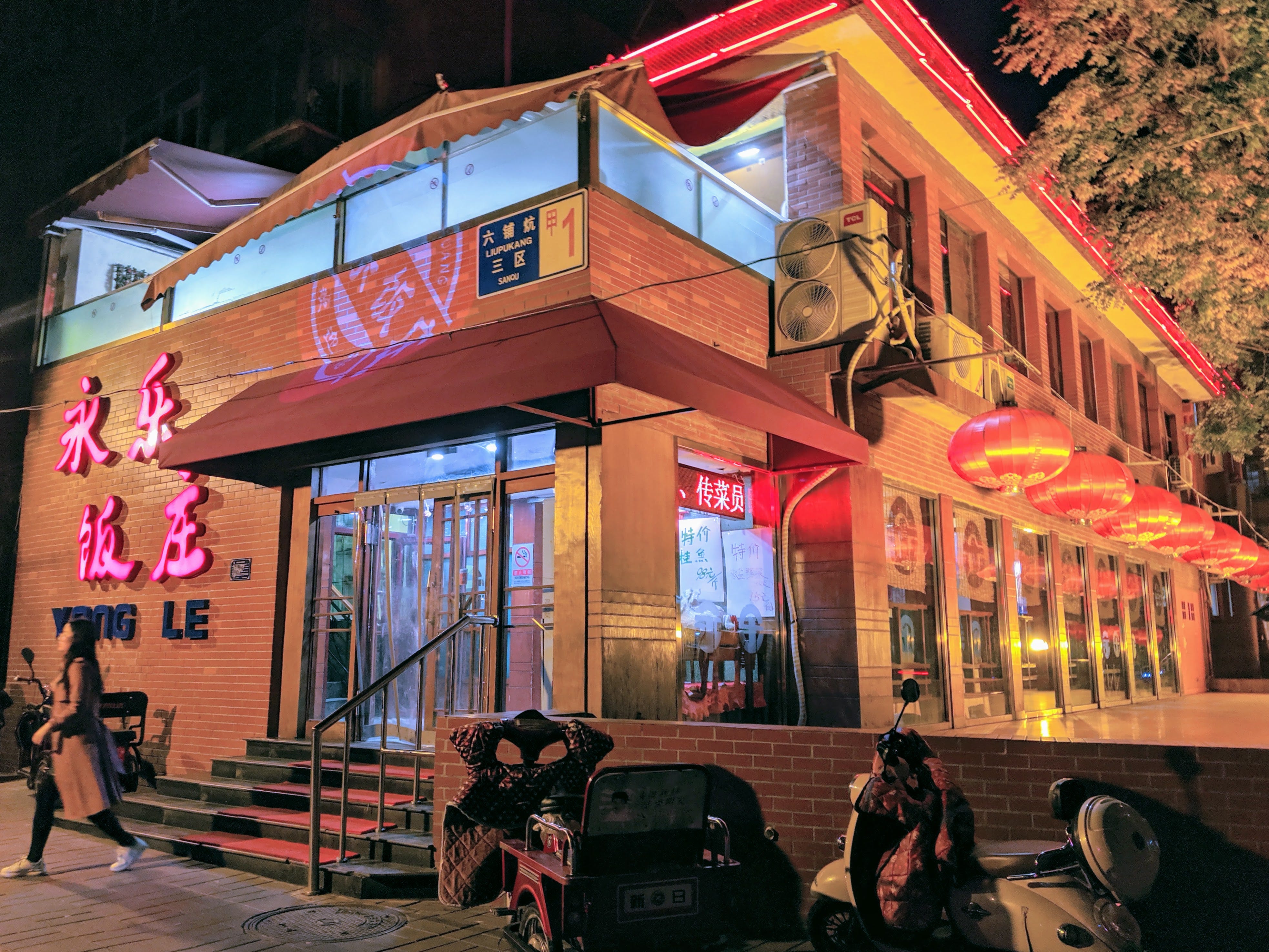 剛到北京的第一晚,我去了永樂飯莊吃飯。計程車到了目的地後,一下車看到的是個只有一層樓高,稍微有些老舊的建築物,外面有個用霓虹燈製作的大招牌,寫著永樂飯莊四個大字。