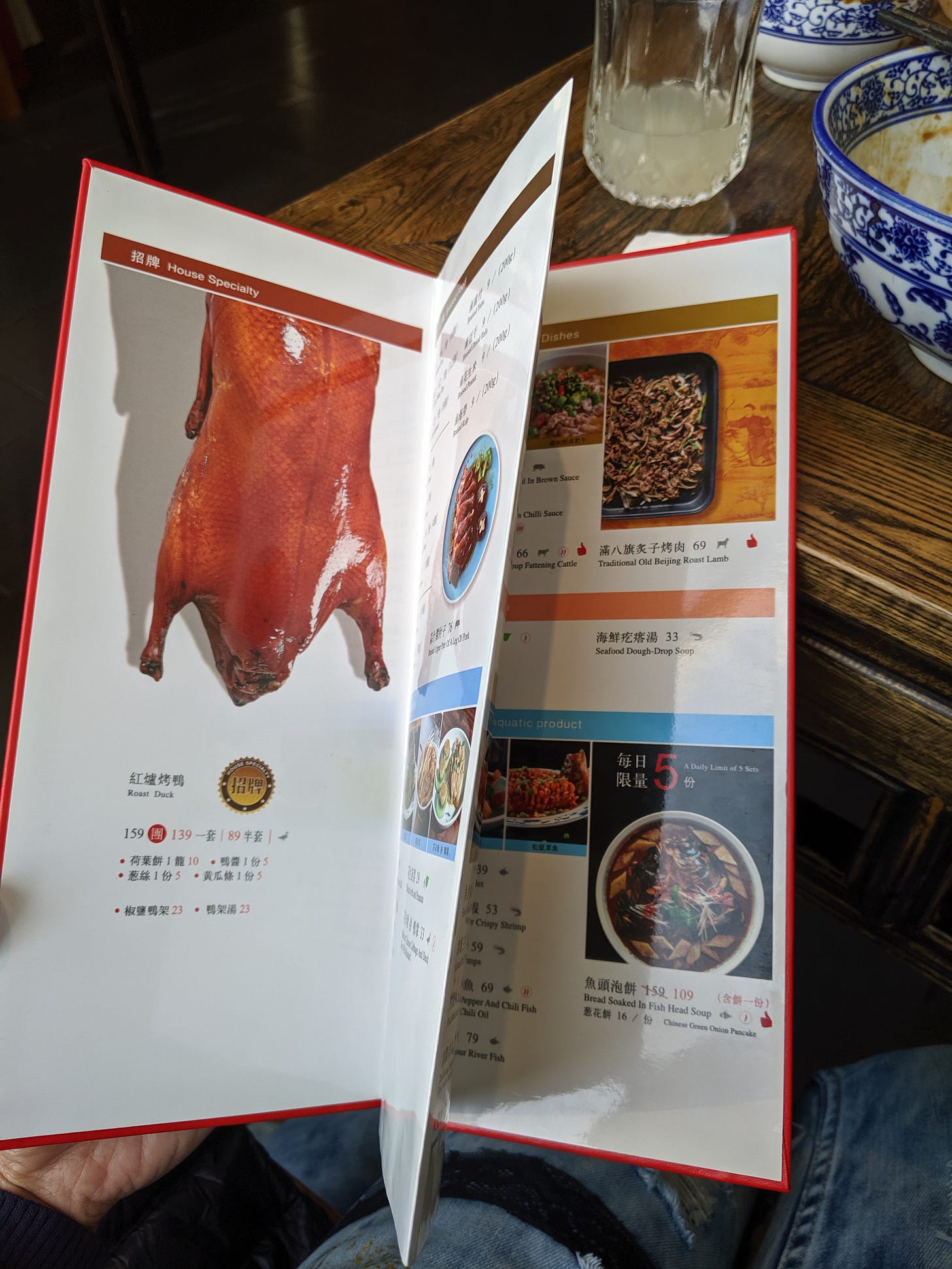 不過記得嘛?我不是被朋友考問,飯莊和飯館有什麼區別? 得知區別的我後來恍然大悟。啊,那些餐廳的菜單厚到可以用來當殺人武器原來是因為他們是飯莊,是個擺酒席的地方。菜單一定要厚。